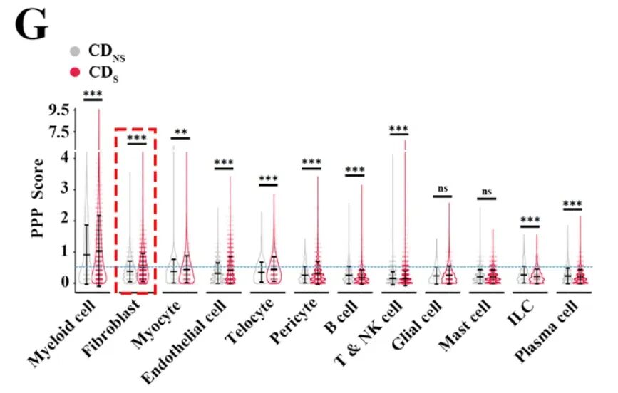 研究发现,在克罗恩病患者的狭窄段(CDS)与非狭窄段(CDNS)组织中,PPP(戊糖磷酸途径)相关代谢物显著增加。例如,木酮糖-5-磷酸(Xu5P)在CDS中的水平比CDNS高出2.049倍(P<0.001)。Xu5P水平还与纤维化评分(相关系数0.570,P<0.01)、标准化磁化转移比(MTR,相关系数0.640,P<0.001)及肠壁厚度(BWT,相关系数0.826,P<0.001)密切相关。这表明PPP的激活与肠道纤维化的严重程度直接相关,提示PPP在肠道纤维化中可能起到关键作用。此外,单细胞RNA测序显示,成纤维细胞是PPP激活的主要细胞类型(图1),这为后续研究提供了重要的细胞靶点。