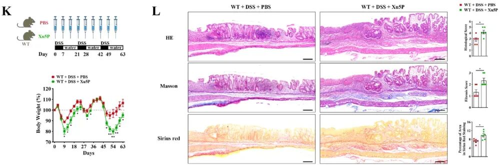实验表明,Xu5P能够显著促进成纤维细胞中胶原基因(如Col1A1)的转录。通过ATAC-seq分析,研究发现Xu5P处理的细胞中胶原基因启动子区域的染色质可及性显著增加,这意味着基因更容易被转录。具体机制是Xu5P增加了H3K27乙酰化(H3K27ac),同时减少了抑制基因表达的H3K27三甲基化(H3K27me3)。这种表观遗传学改变直接促进了胶原基因的转录,导致细胞外基质过度合成。在体内实验中,Xu5P处理的小鼠在DSS诱导的肠道纤维化模型中表现出更严重的胶原沉积和纤维化加重(图2),进一步证实了Xu5P的促纤维化作用。