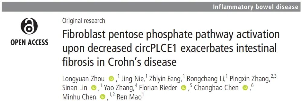 ZHOU L, NIE J, FENG Z,et al. Fibroblast pentose phosphate pathway activation upon decreased circPLCE1 exacerbates intestinal fibrosis in Crohn's disease[J]. Gut,2025:gutjnl-2025-336415.DOI:10.1136/gutjnl-2025-336415.
